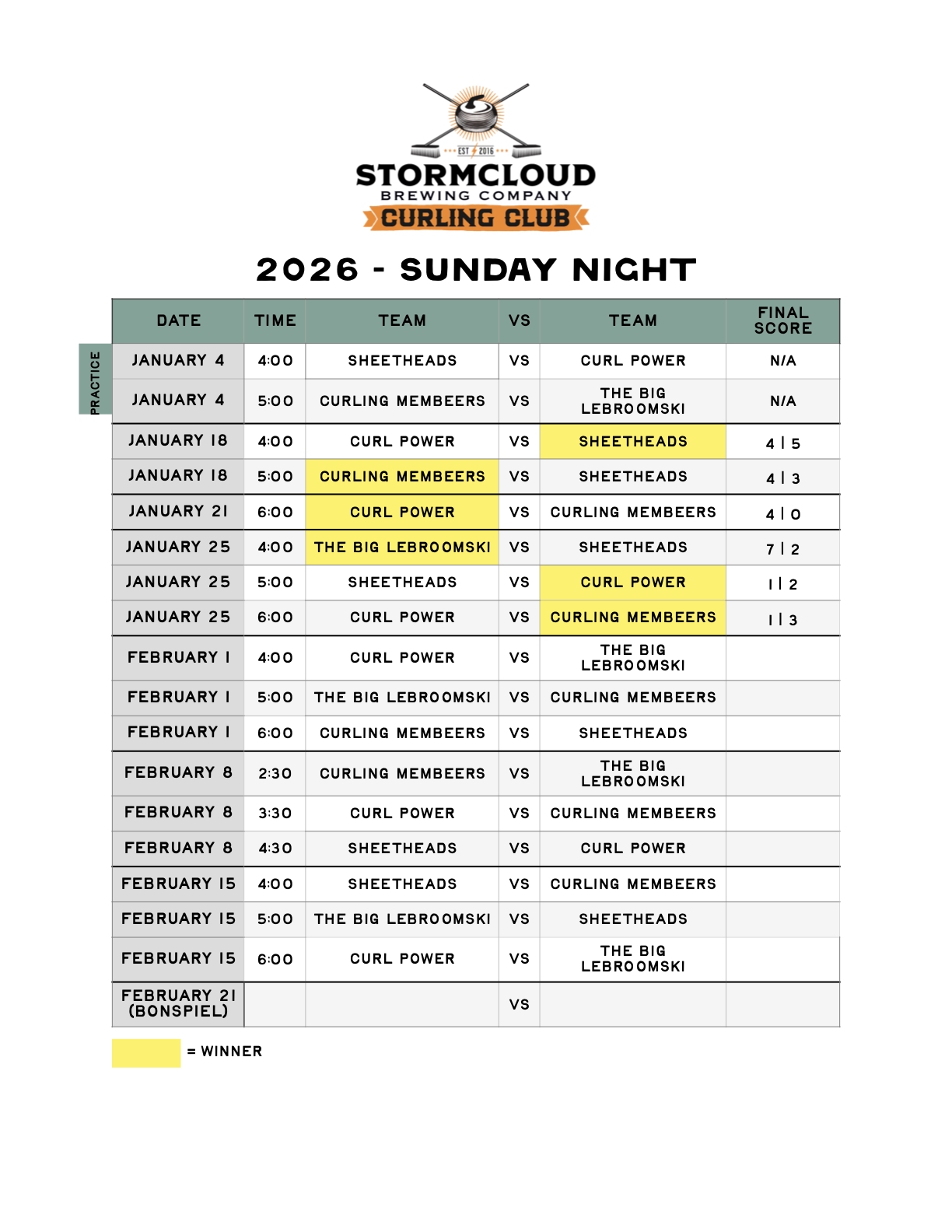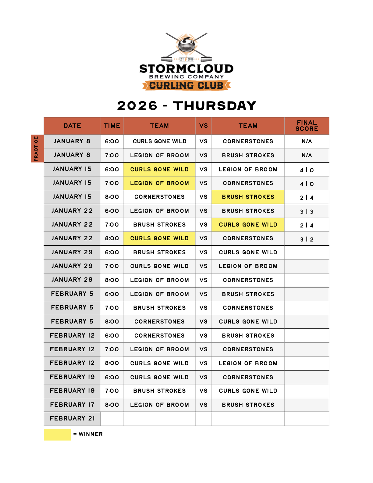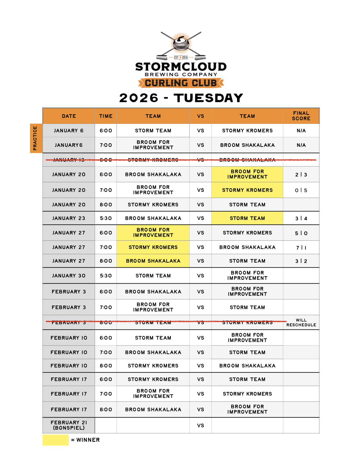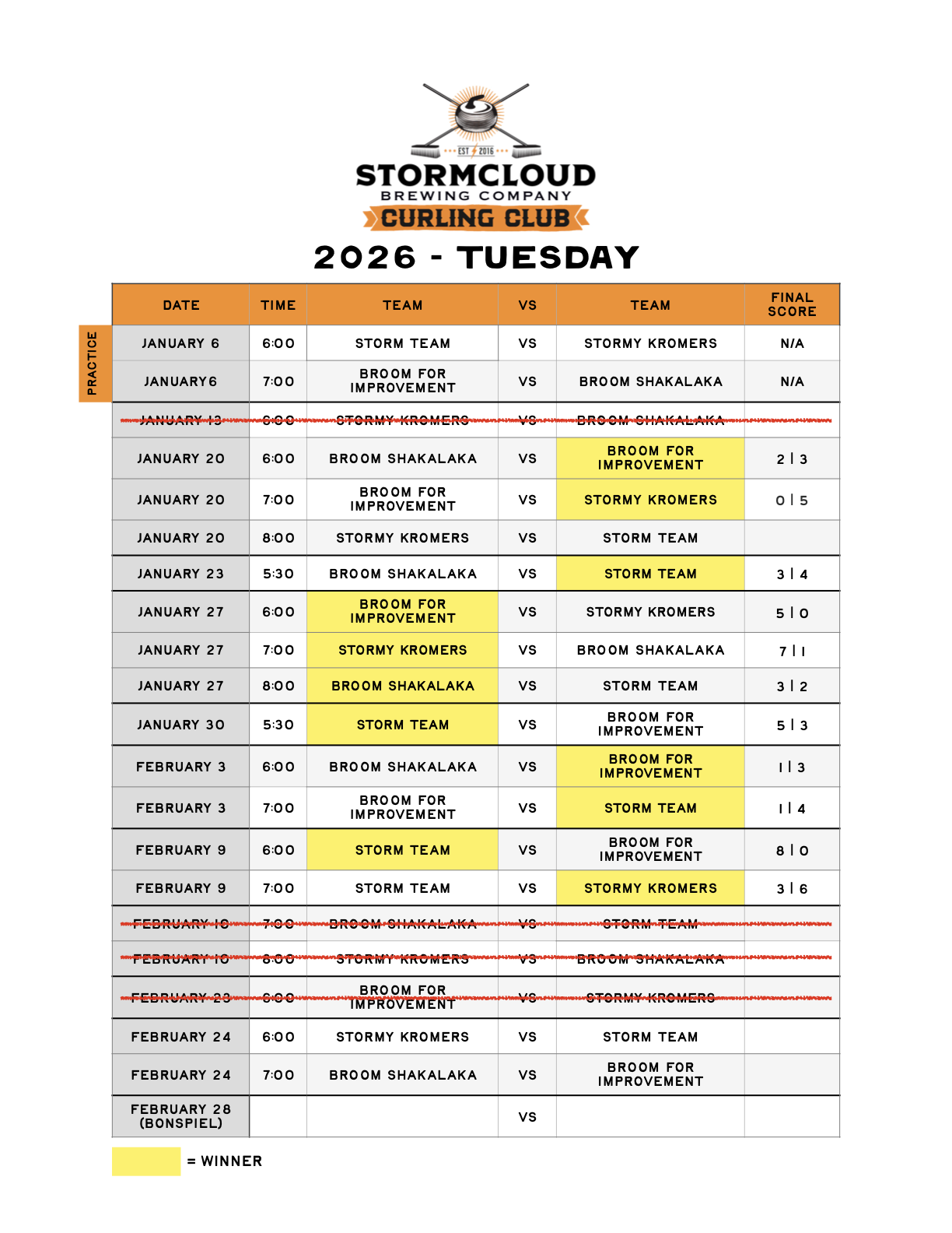 Season: 8 weeks total. Includes one day of warm-up, six weeks of competition, and an end-of-season tournament and party.
